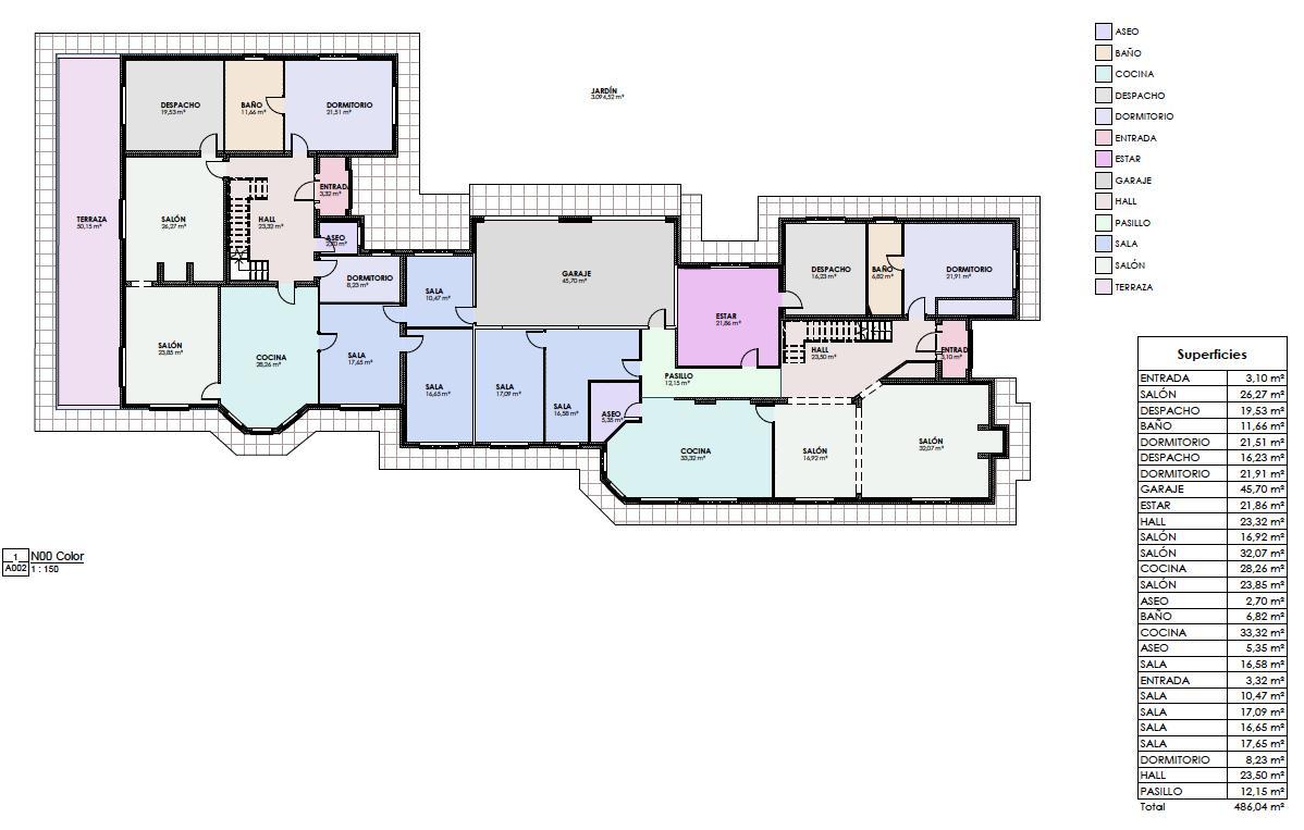 La planta baja permite una independencia total entre el ala de invitados o representación y el ala privada de la familia. Con una superficie de 486 m² solo en esta planta, el espacio se distribuye de la siguiente manera: